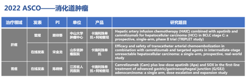 作为壁报接收的1篇是中山大学肿瘤中心顾仰葵教授等开展的TRIPLET研究(NCT04191889)。在线发表的两篇分别是山东省肿瘤医院宋金龙教授等开展的一项经肝动脉栓塞化疗(TACE)联合卡瑞利珠单抗加TKI类靶向药物治疗中期不可切除肝癌的单臂、前瞻性、真实世界研究(ChiCTR2000039508),和江苏省人民医院陈晓锋教授等开展的“双艾”联合化疗一线治疗晚期胃/胃食管结合部癌的单臂、剂量爬坡和扩展研究(ChiCTR2000034109)。其中,TRIPLET研究是一项前瞻性、单臂、Ⅱ期研究,采用“双艾”联合肝动脉灌注化疗(HAIC)治疗BCLC C期肝癌,研究采用Simon两阶段研究设计,研究者曾在ESMO 2021大会作为壁报报告过第一阶段研究结果,扩大患者入组后数据更新,2022 ASCO接收为壁报,期待更新后的疗效数据。